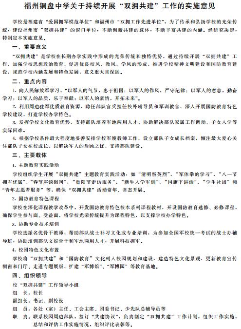 福州铜盘中学关于持续开展“双拥共建”工作的实施意见